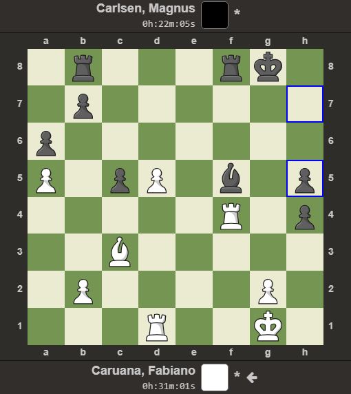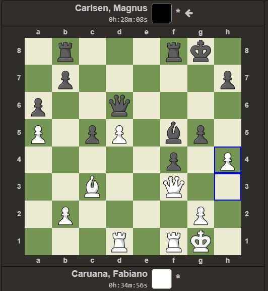 Понимает Фабиано, что ситуация может усугубиться. Предпочитает не форсировать события и лишь укрепляет свои позиции. Ставит пешку на h3.