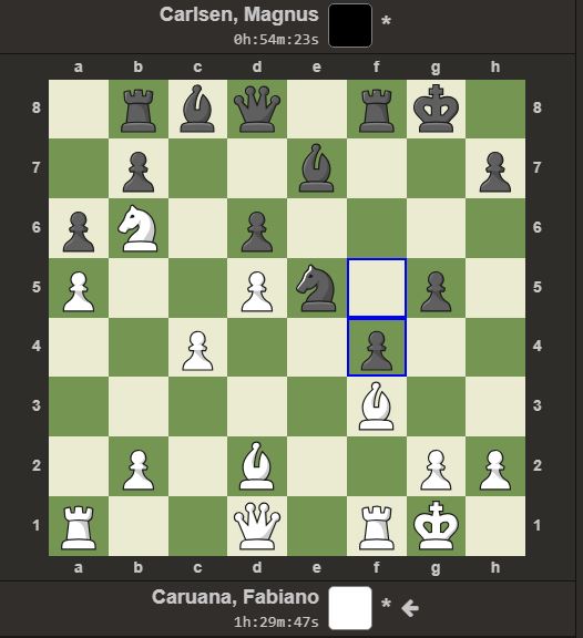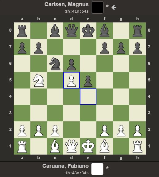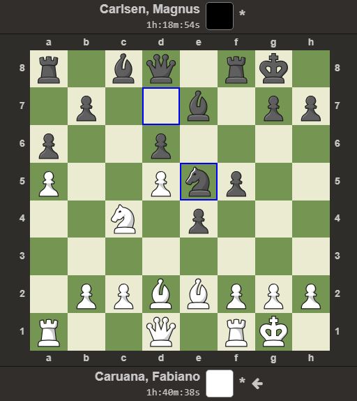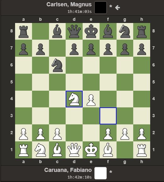 Каруана ходит конем на с4, Карлсен же провоцирует американца в контратаке конем на е5.
