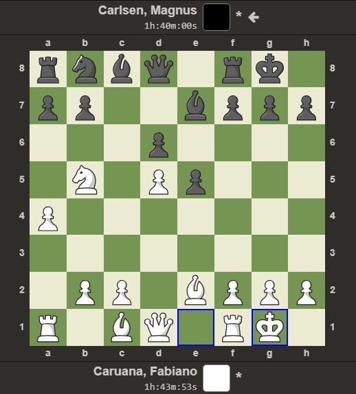 Магнус проводит короткую рокировку. Так же играет и Каруана.