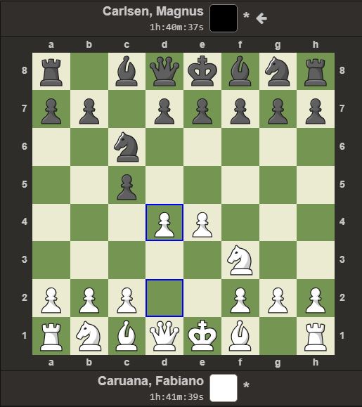 Начинаем! Фабиано Каруана не изменяет своему стилю и делает ход королевской пешкой на е4.