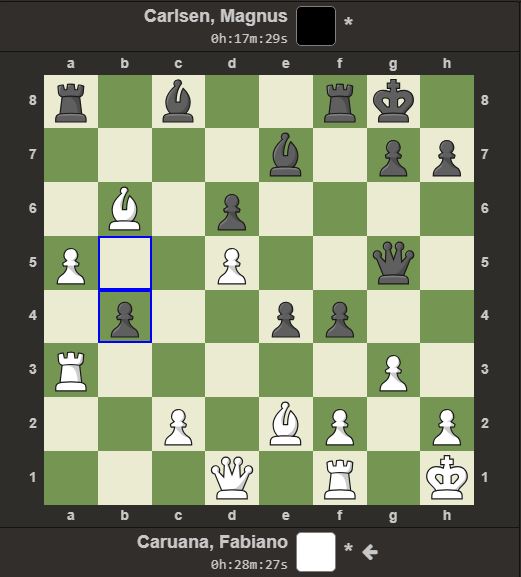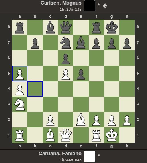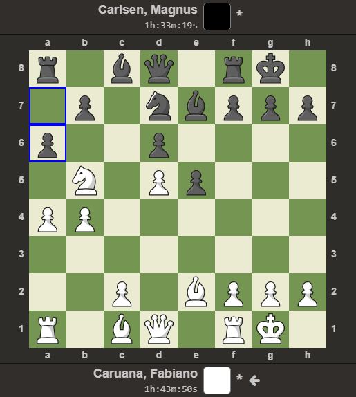 И задумался над ходом Карлсен. Не ожидал он крайнего решения Фабиано. Напрашивается ход пешкой на а6, чтобы прогнать коня.