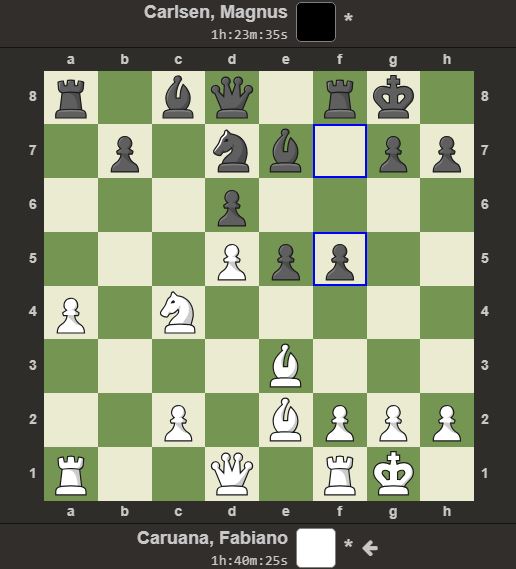 Раскрепощенно чувствует себя Каруана и играет слоном на е4. Карлсен же делает незамысловатый ход пешкой на f5.