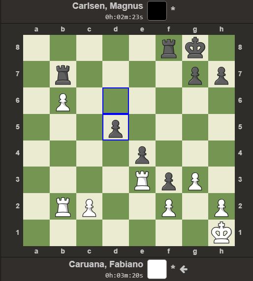 Проверяет на прочность Магнуса Фабиано — ладья на d1. У норвежца очень мало времени осталось. Теперь-то видно, что очень много времени растерял чемпион в начале партии.