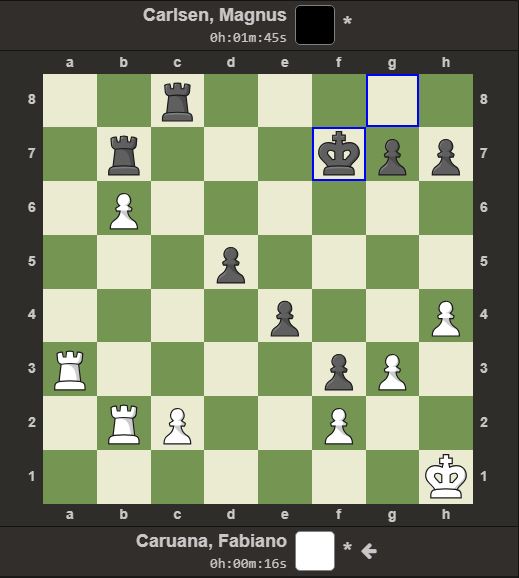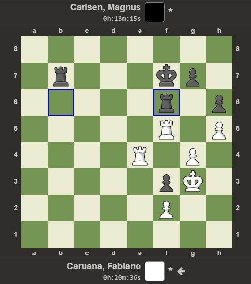 Переводит ладью на с8 Магнус, Фабиано сразу же отвечает ладьей на а3. Карлсен идет королем на f7.