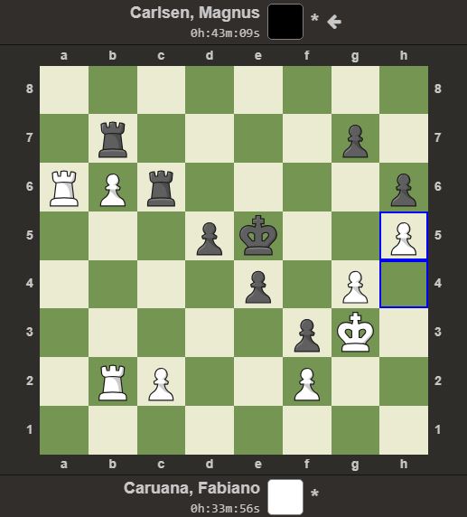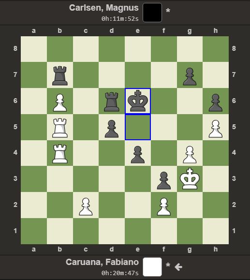 Осталось 9 секунд до конца времени у Каруаны, но американец играет королем h2 и переходит контроль времени. Магнус отвечает королем на е6 и также получает дополнительные 50 минут.
