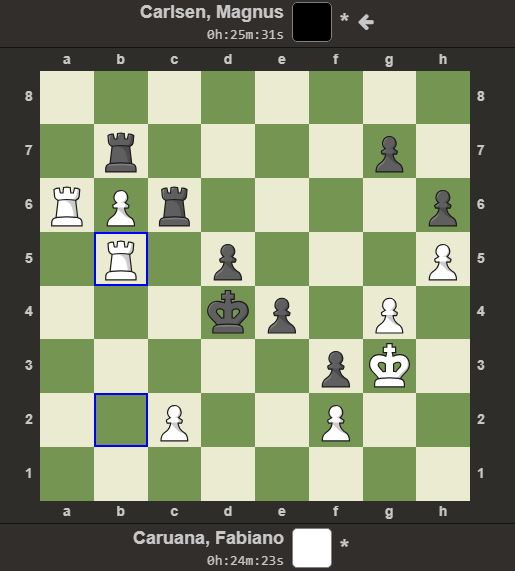 Ладья b2 от Каруаны, мгновенно отвечает на это Карлсен ладьей на b7.