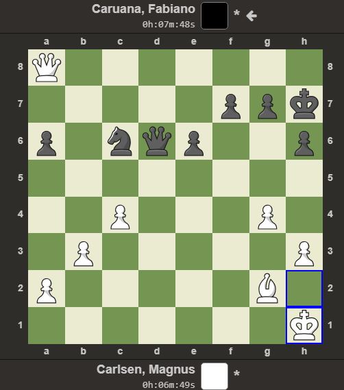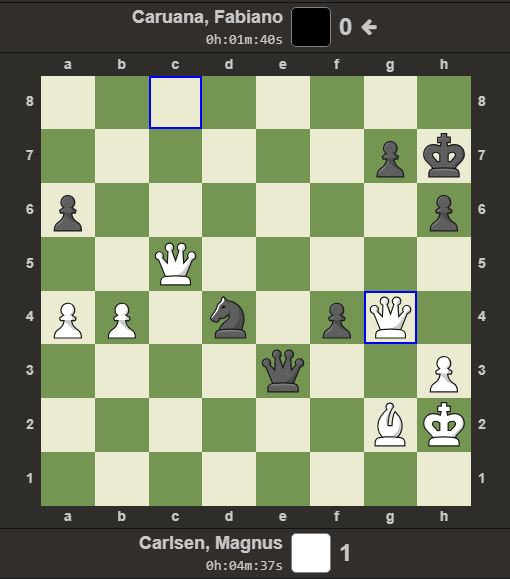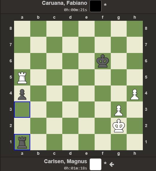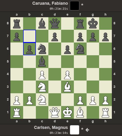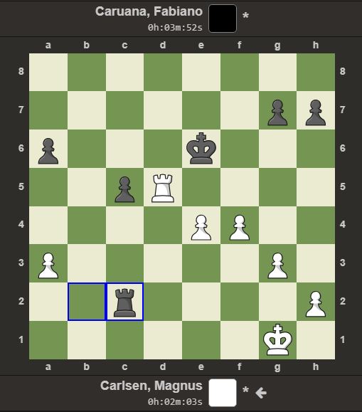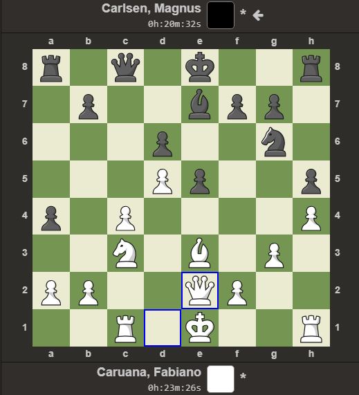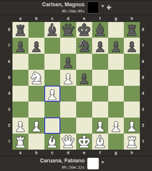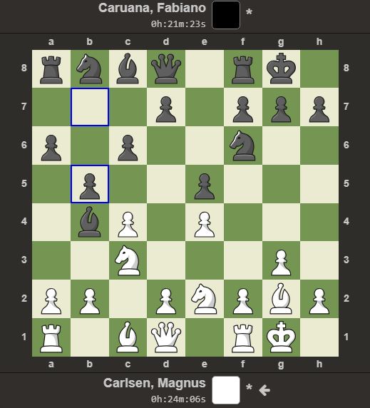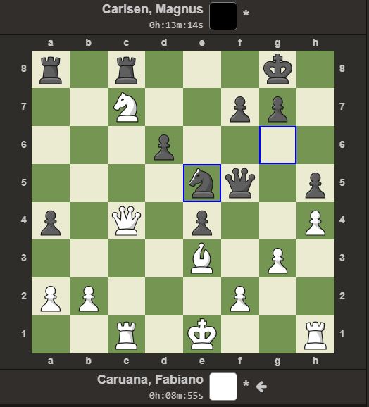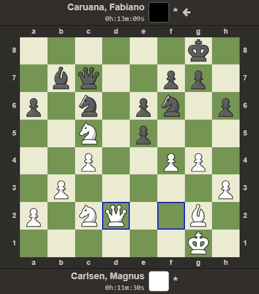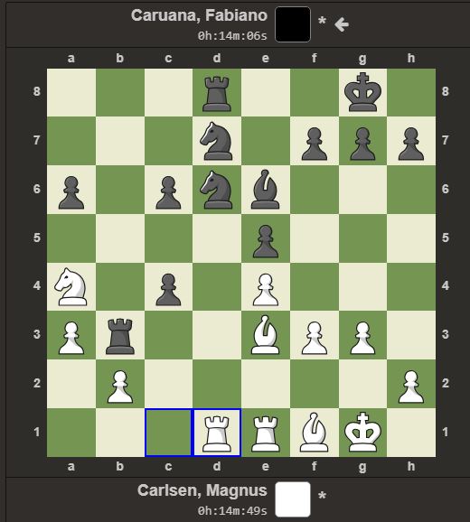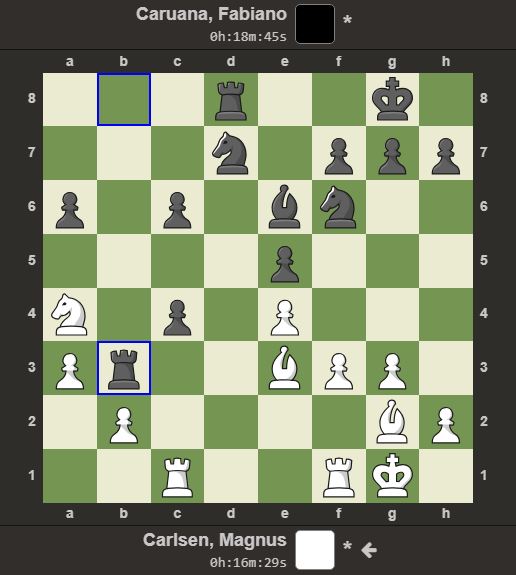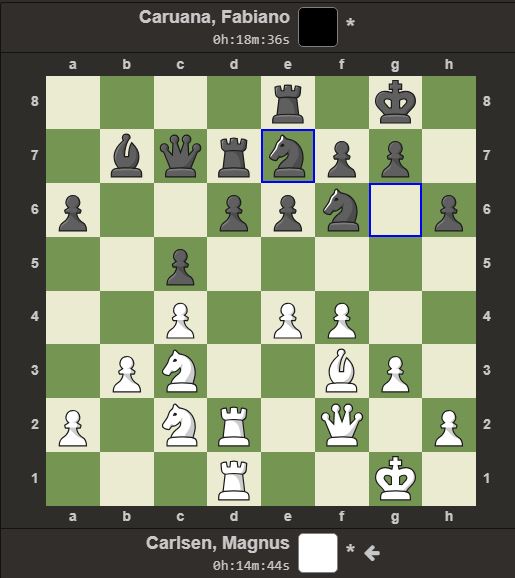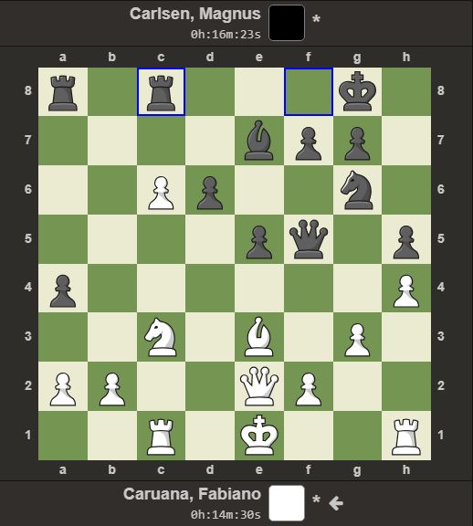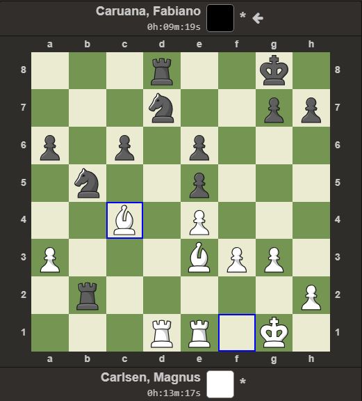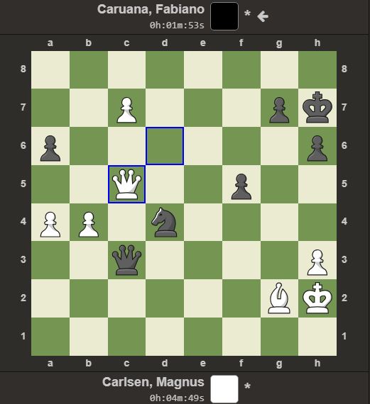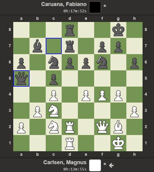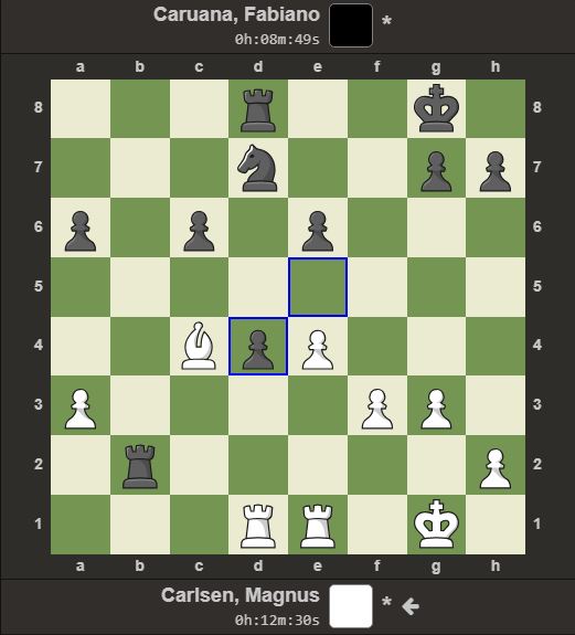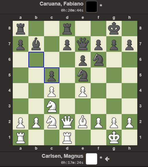 Пожалуй, поспешил с ходом на с5 Фабиано. Теперь задумался претендент. На 5 минут у него меньше, чем у Магнуса.