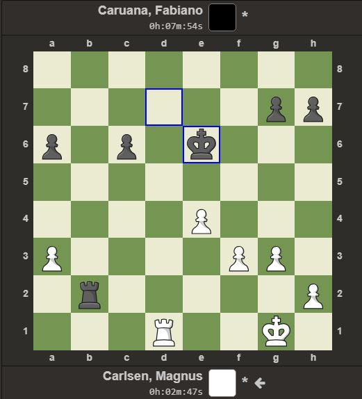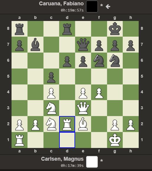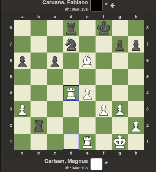 Ладью на d1 переводит Карлсен, Каруана же ставит под контроль пешку на линии е.