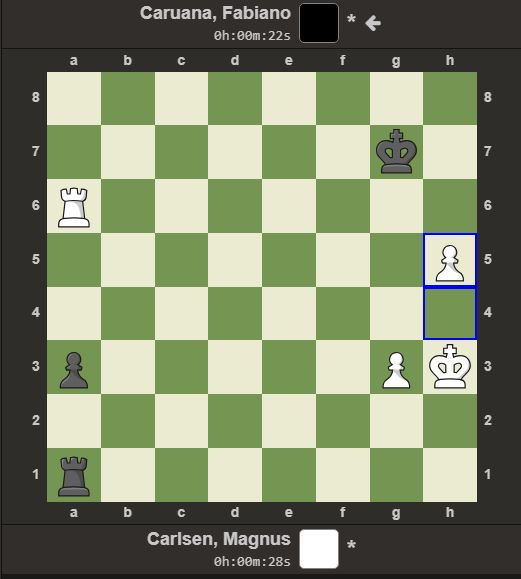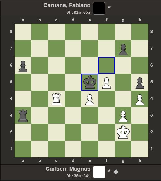 Вперед двигает пешку и Каруана — с5-с4. Карлсен ставит шах черному королю, переводя пешку на f5. Уходит Фабиано.
