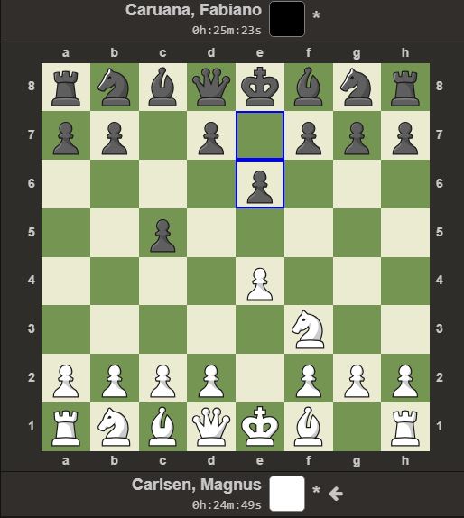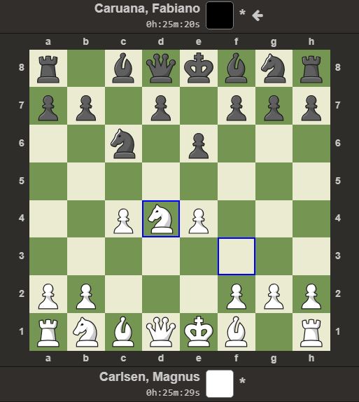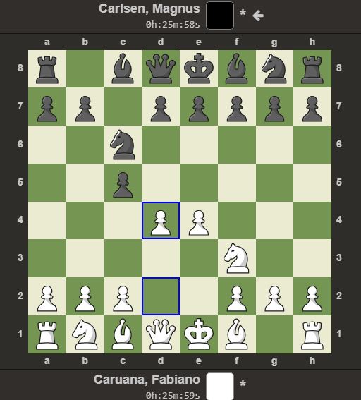 Пешка d2-d4 от Карлсена, Фабиано также двигает пешку по линии d — d6.