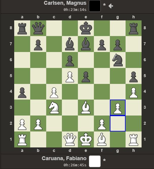 Каруана оставляет ситуацию напряженной. Идет быстро, но надежно конем на с6. Карлсен чувствует себя комфортно и играет пешкой на g4.