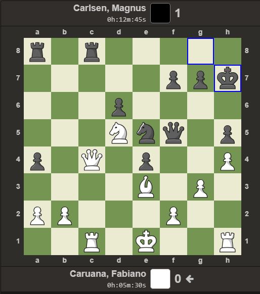 Вынудил Карлсен убрать пешку на линии а от Каруаны, Магнус быстро ест пешку, а затем Каруана сдается!