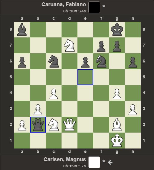 Отвечает конем на с5 Магнус, Каруана же сразу бьет пешку на b2.