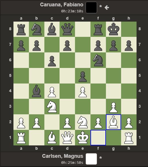 Слоном на е2 идет Карлсен, Каруана отвечает слоном на b7. Магнус сразу же проводит короткую рокировку.