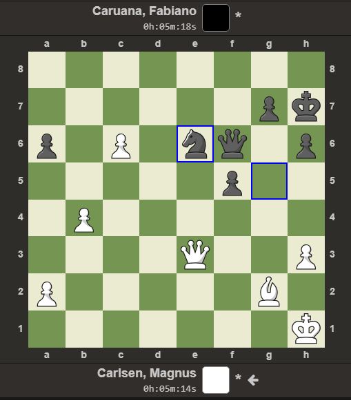 Переводит ферзя на f5 Магнус, Фабиано сразу же идет пешкой на с5.