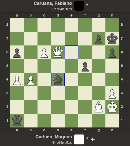 Сравнялись по времени шахматисты. Каруана идет конем на d5.