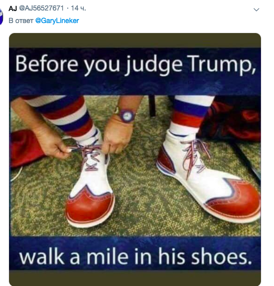 «Прежде чем шутить над Трампом, пройди одну милю в его обуви», — написал другой комментатор, прикрепив картинку клоунских ботинков.