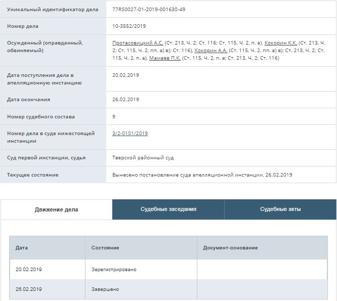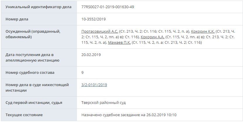 Защита Александра Кокорина, его младшего брата Кирилла, Павла Мамаева,а также четвертого фигуранта дела в драках в центре Москвы Александра Протасовицкого подала апелляцию на решение Тверского суда Москвы о продлении ареста обвиняемых в избиении избиении главы департамента Минпромторга Дениса Пака, гендиректора НАМИ Сергея Гайсина, а также водителя ведущей Первого канала Ольги Ушаковой Виталия Соловчука еще 14 февраля. Изначально заседание о рассмотрении жалоб было назначено на 25 февраля, но впоследствии было перенесено на день позже.