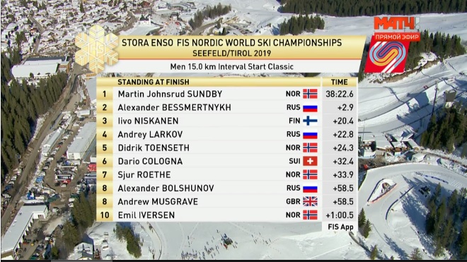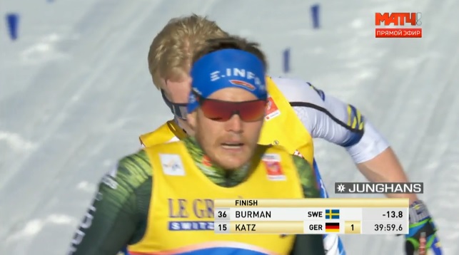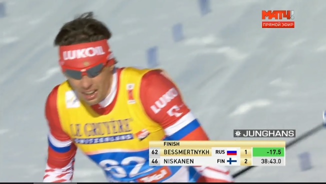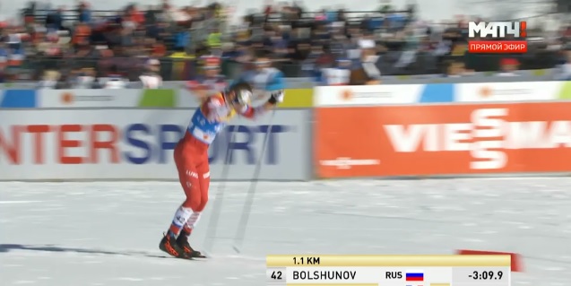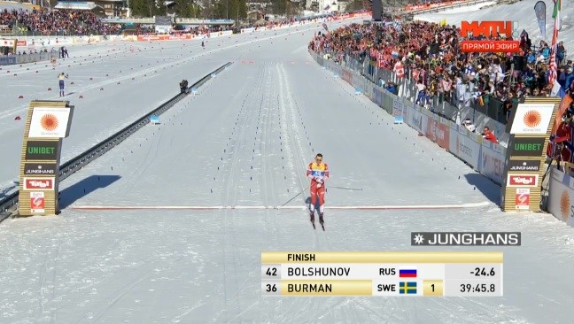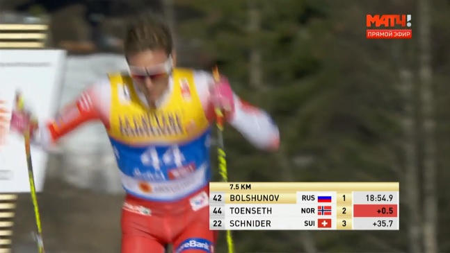 Большунов несколько секунд побыл лидером на финише, однако тут же его обогнал Тёнсет, причем сразу на 32 секунды.