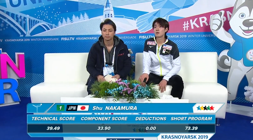 73,39 балла получает Шу за короткую программу. Доволен собой японец.