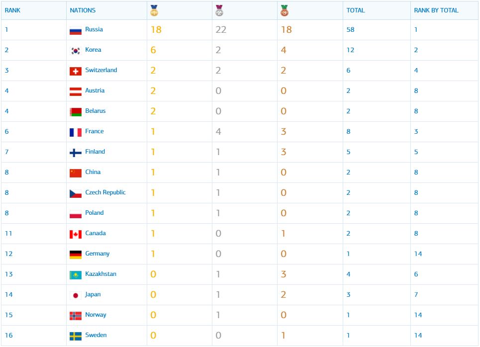 В этот день сборная России повторила рекорд по числу завоеванных медалей на одной зимней Универсиаде. Количество завоеванных медалей уже достигло 71 (23 золотые, 26 серебряных и 22 бронзовые награды). А если говорить конкретно об этом дне, то россияне завоевали 13 медалей — пять золотых, четыре серебряных и четыре бронзовых.