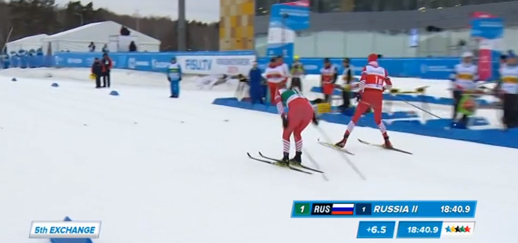 Стартовала гонка. У первой команды России бежит Александр Терентьев, у второй — Андрей Собакарев.
