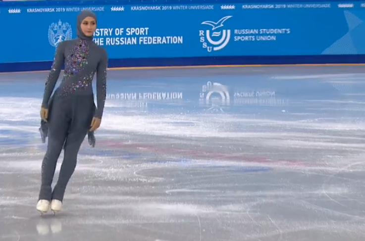 Представительница ОАЭ Захра Лари выступает. Необычный костюм для фигурного катания.