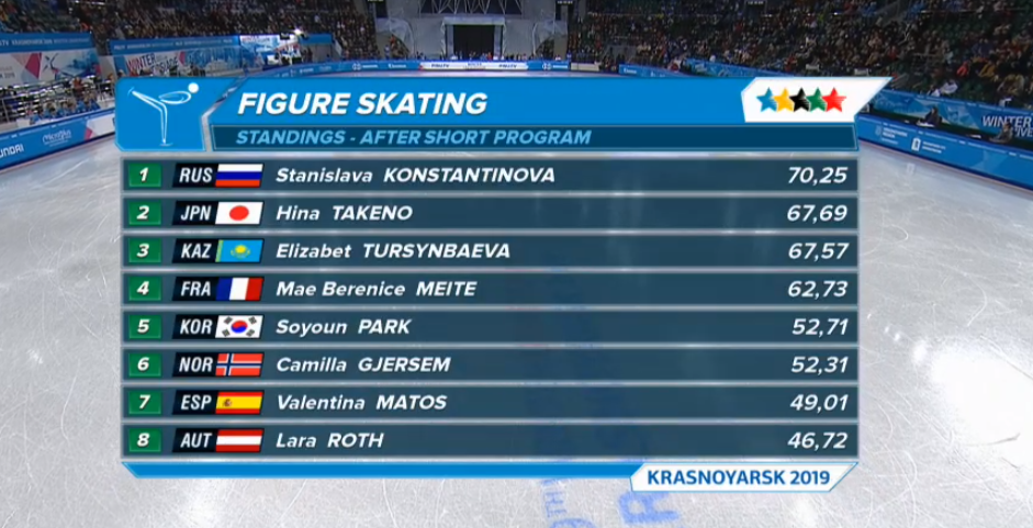 Итак, подведем итоги короткой программы: на первом месте оказалась представительница Японии Мая Михара, она обошла Станиславу Констатинову, которая занимает вторую строчку. Мария Сотсткова, увы, лишь седьмая.