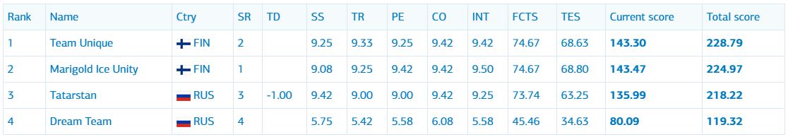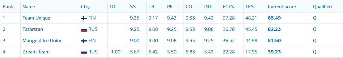 После короткой программы лидирует финская команда Team Unique.