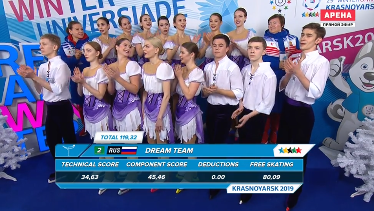 Выигрывает произвольную программу команда Marigold Ice Unity, опередив своих соотечественников из Team Unique на 0,17 балла. Но для победы в соревнованиях этого оказалось недостаточно.