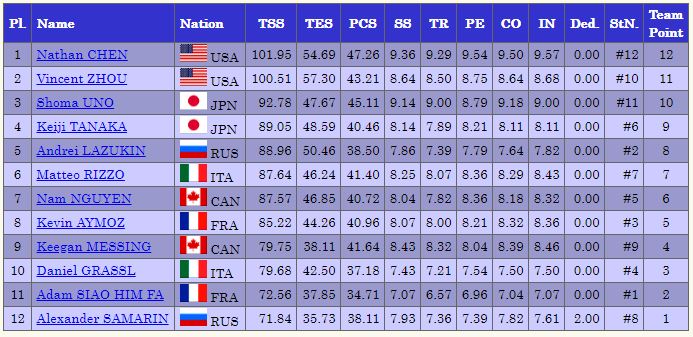 Вот это да. Занимает первое место японец. И это несмотря на грубейшую ошибку при тройном акселе!