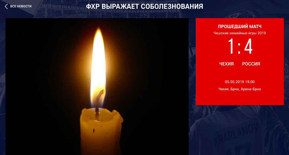 На официальном сайте Федерации хоккея России (ФХР) была опубликована запись с соболезнованиями по поводу произошедшего.
