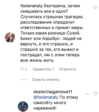 «Екатерина, зачем смешивать все в одно? Случилась страшная трагедия, расследование определит ответственных и примет меры. Только какая разница — Sukhoi, Boeing или Airbus — людей не вернуть, и это страшно, и страшно за тех, кто выжил и пострадал, им с этим теперь всю жизнь жить», — написал пользователь под ником Foxienataly.