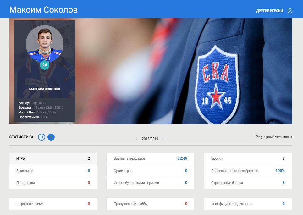 Максим Соколов-младший, к слову, выдающимся спортивным прогрессом не отличался. В прошедшем сезоне он провел лишь две игры, в общей сложности чуть более 22 минут. Отразил восемь бросков. Более детальной информации на сайте молодежной команды СКА нет.