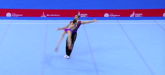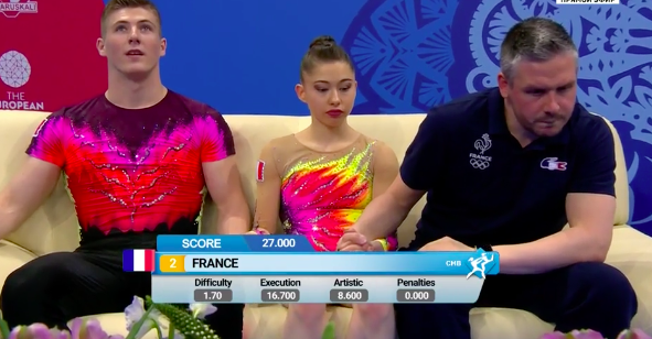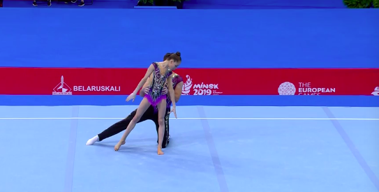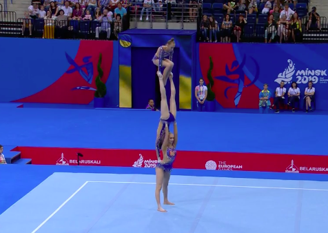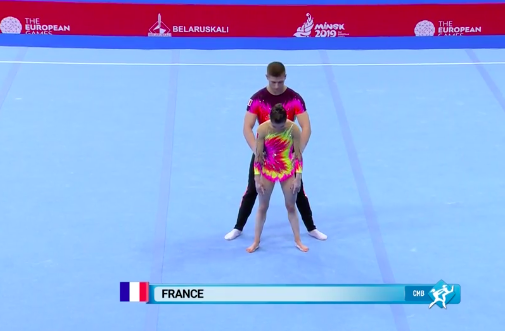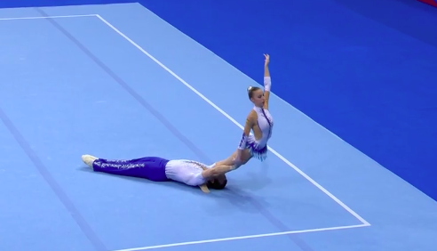Испанки неплохо выступили, не допустив серьезных ошибок. На ковре уже дуэт акробатов из Франции, который показывает драматичный номер, — девушка повисает на партнере, и тот тащит ее вперед на себе. Художественная составляющая у французов всегда весьма неплохая.
