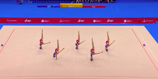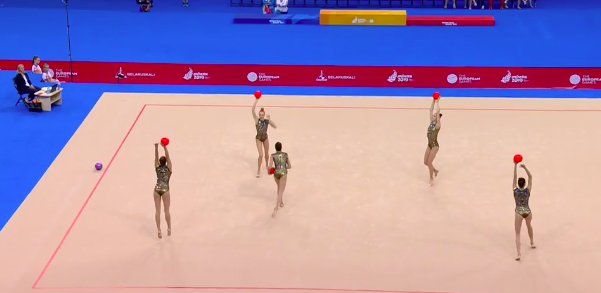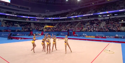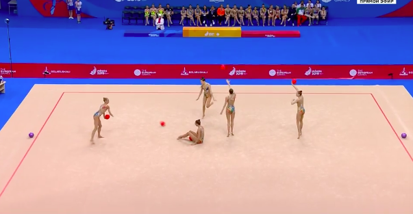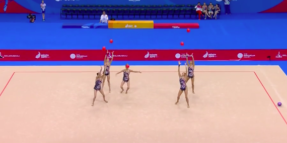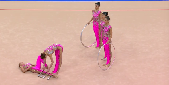 Отличное выступление азербайджанок! Удалось ни разу не потерять предметы, несмотря на сложность. Девушки нередко подхватывали обруч не в руки, а ногами, и одним ударом умудрялись переправить их дальше другим партнершам.