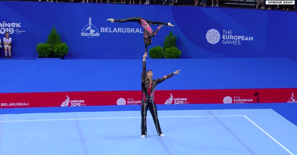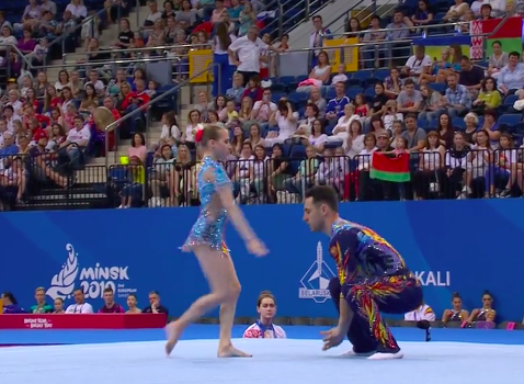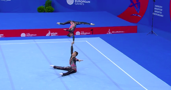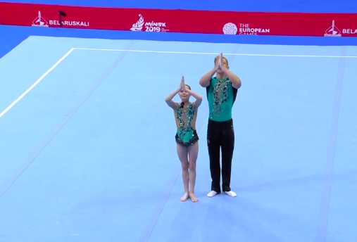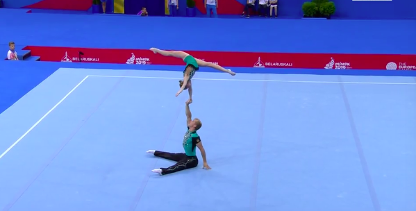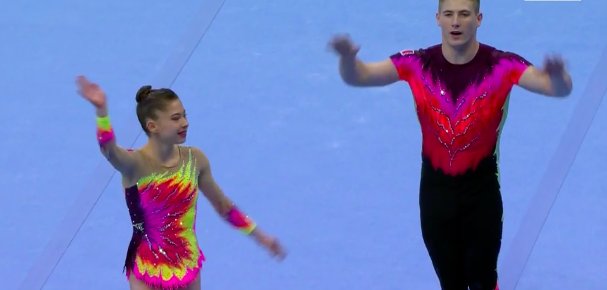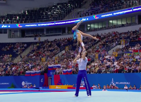 Сразу же начинаются соревнования по акробатике среди смешанных пар. Прямо никакой передышки нет! Зрителям только на радость. Первым выступает дуэт из России под задорные испанские мотивы.