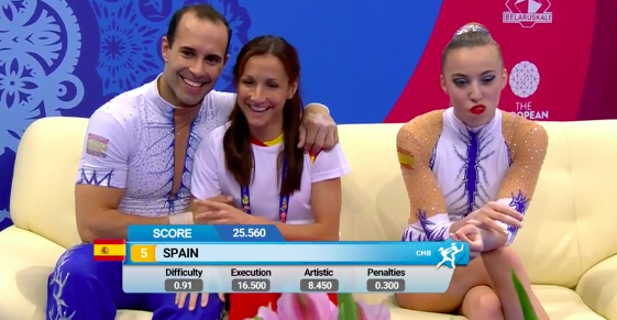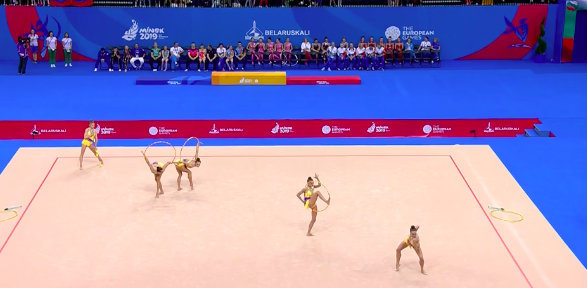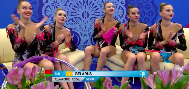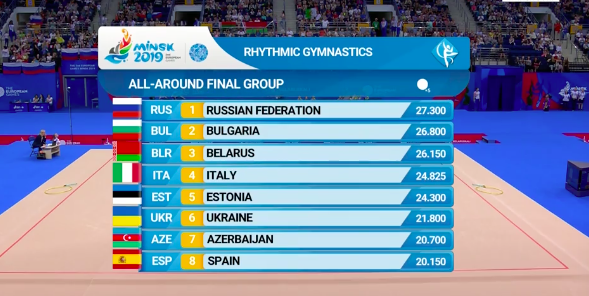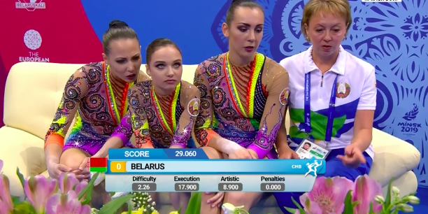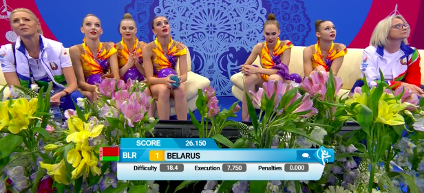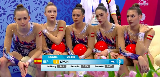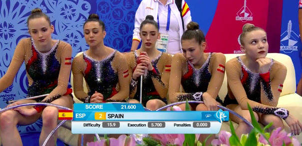 Белоруски закончили выступать под общий рев трибун — все было очень даже неплохо. Тем временем становятся известны оценки испанок-групповичек, выступивших ранее. Не очень довольны девушки — собственные ошибки их изрядно подвели. Но команда молодая, еще есть, куда расти.