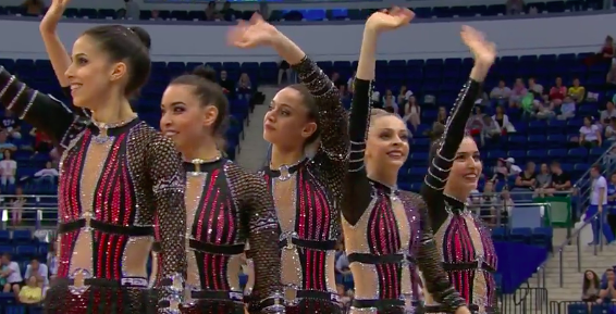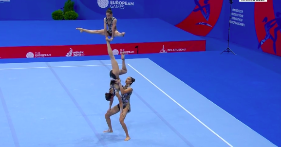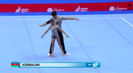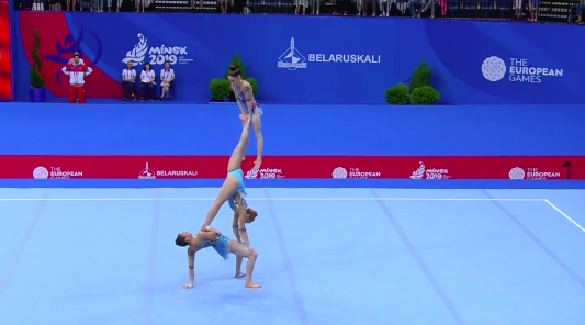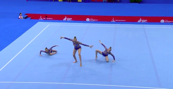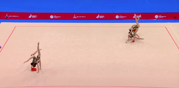 Азебайджанки показывают программу под песню Imagine Dragons — Natural. В целом все гладко, но им словно не хватает драйва и какого-то привычного блеска. Это можно понять — капитан команды получила травму, так что сейчас гимнастки чувствуют себя немного не в своей тарелке, выступая с менее опытной партнершей Дарьей Сорокиной.