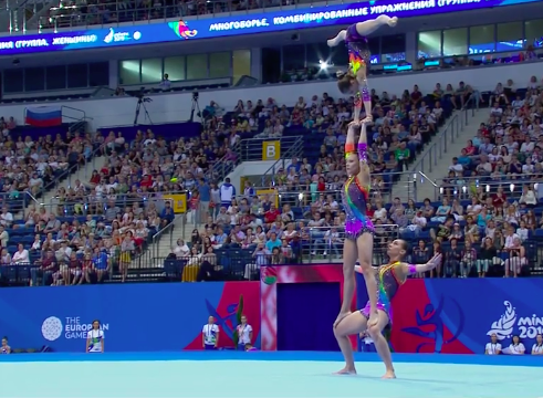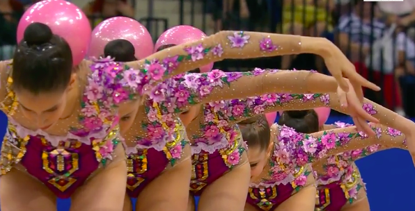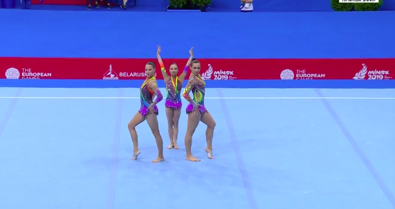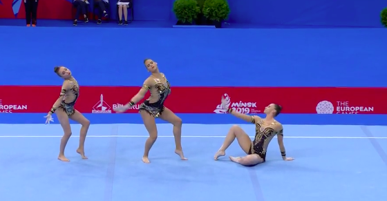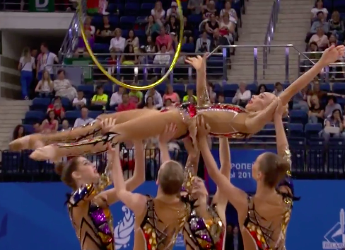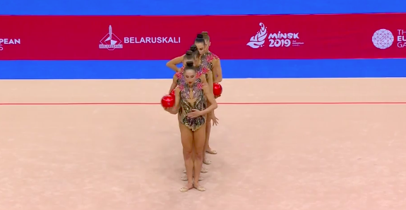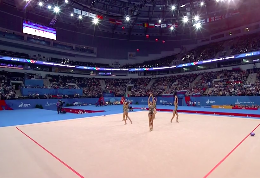 Очень сложное выступление продемонстрировали белорусские спортсменки под интересную композицию с шаманскими мотивами, где современный бит причудливым образом перемешался с горловым пением. Мяч постоянно носился где-то в воздухе, девушки перекидывали его друг другу и, не глядя, отбивали спиной третьей напарнице — в общем, сложность на вполне приемлемом уровне. Все очень стильно, без явных ошибок.