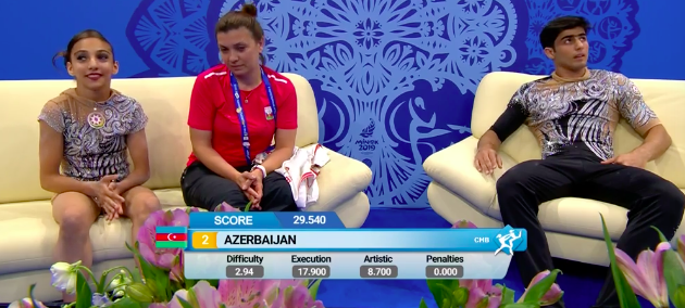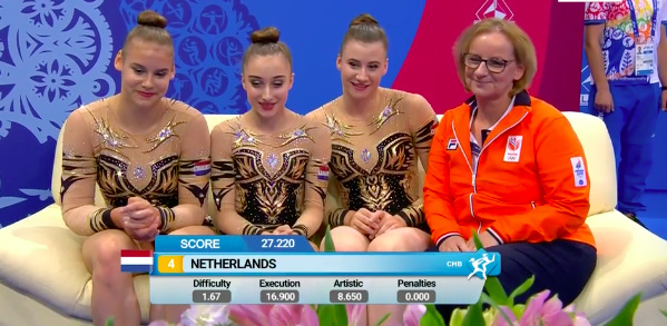Выступление команды Азербайджана завершилось. Девушки не очень довольны. Тем временем стали известны оценки акробатического трио из Голландии, которые показывали номер под музыку Загитовой.