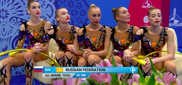 И Россия занимает первое место в групповых упражнениях с пятью мячами! Поздравляем!