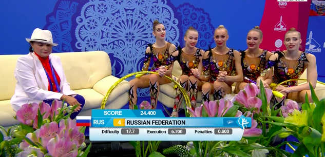 Оценка сборной России расстраивает... лишь четвертое место. Нашли какие-то ошибки судьи. В итоге по сумме баллов за два упражнения — с пятью мячами и тремя обручами и двумя парами булав — Россия пока держится на третьем месте. То есть это промежуточное третье место в многоборье. Но еще будут выступать итальянки!