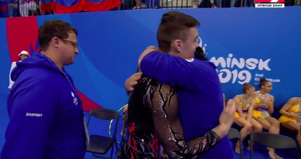 Тренеры обнимаются — без ошибок выступили украинки. Синхронные вращения и пролетные прыжки сквозь обручи выглядели впечатляюще.