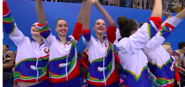 Выступает команда России! Девушки с самого начала творят что-то невероятное: крутят обруч на одной ноге, а потом, не глядя, одним бросок отправляют его куда-то назад, и он прилетает прямо в руки партнерше!