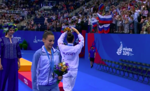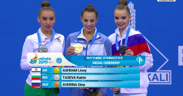 Сейчас происходит награждения за программы с булавами! Аверина снова тут как тут — у нее серебро. На все виды награждений выходит россиянка. Золото у Линой Ашрам, бронза — у украинки Влады Никольченко.
