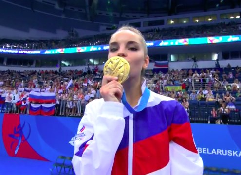 Тем временем проводится церемония награждения. Свои медали получают призеры и победители прошедших финальных соревнований с обручем, мячом, булавами и лентой. Напомним, Дина Аверина одержала победы в финале упражнений с обручем и лентой, а также завоевала бронзу и серебро по итогам номеров с мячом и булавами соответственно.