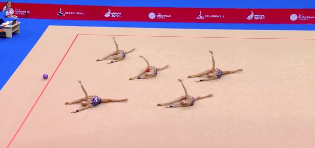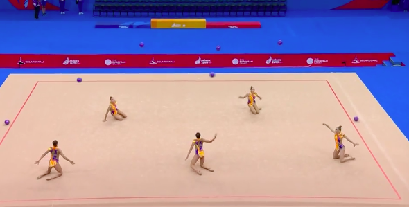 А вот сейчас уже будут выступать «художницы» в групповых упражнениях. Команда Белоруссии первой показывает программу с пятью мячами.