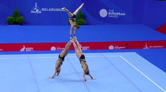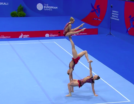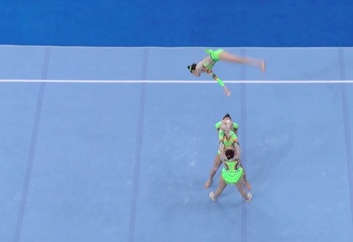 Стоит отметить, что групповые упражнения в художественной гимнастике будут идти вперемешку с выступлениями акробаток, как и вчера. Сейчас группы девушек из трех человек соревнуются в многоборье. Первыми выступают португальские акробатки — они творят что-то невероятное.