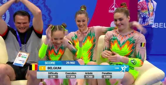 А сейчас мы узнаем оценки акробаток из Бельгии! Они поднимаются на первое место и обнимают друг друга, крича от счастья.